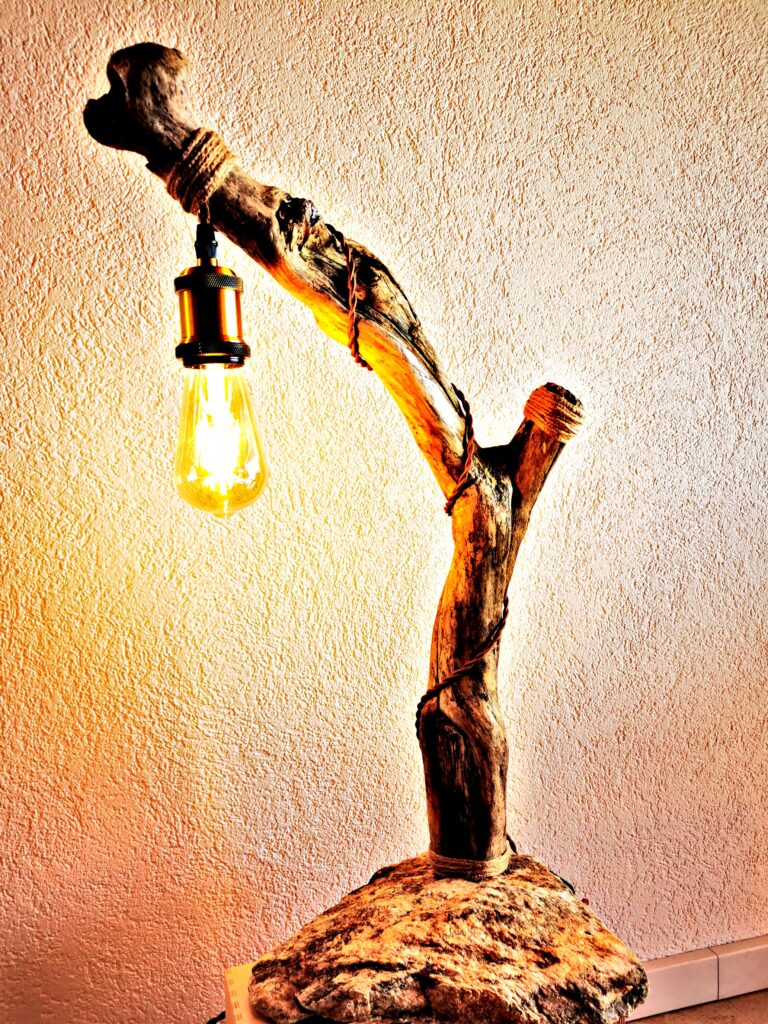 Schwemmholz-Lampen mit Holz-, Beton- oder Steinsockel